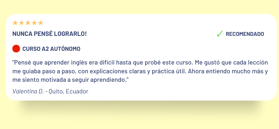 Aprende inglés a tu ritmo, sin perder el tiempo. Accede a lecciones en vídeo, ejercicios prácticos y tests que te muestran que tu avance real.